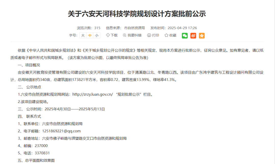 六安天河科技学院规划出炉