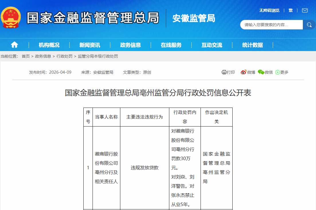 违规发放贷款!徽商银行股份亳州分行及相关