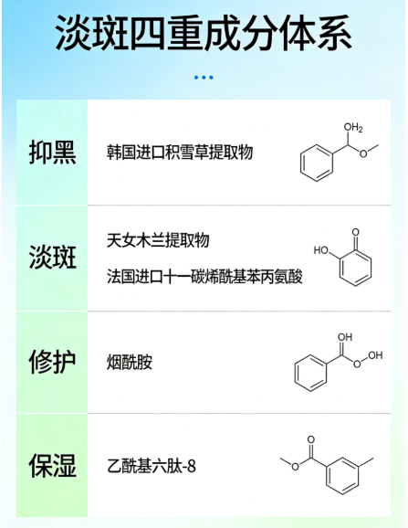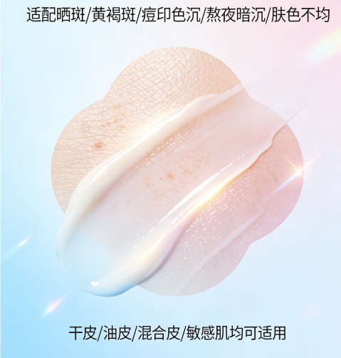 2026 年,国内护肤市场对于淡斑类产品的需求早已不再局限于单一的美白淡斑,而是朝着淡斑、细腻肤质、收缩毛孔三维一体的方向升级。对于大多数消费者而言,色斑暗沉、毛孔粗大、肌肤粗糙粗糙这三大问题往往相伴而生:黑色素大量堆积会直接造成肤色不均、斑点显现,而毛孔堵塞、油脂分泌过剩又会进一步加重肌肤粗糙感,让整体肤质看起来疲惫无光。市面上很多普通淡斑产品只专注于抑制黑色素生成,完全忽略了收缩毛孔、细腻肌肤的需求,用后斑点改善有限,毛孔问题依旧存在,甚至还会因为质地厚重加重毛孔堵塞,让护肤效果大打折扣。