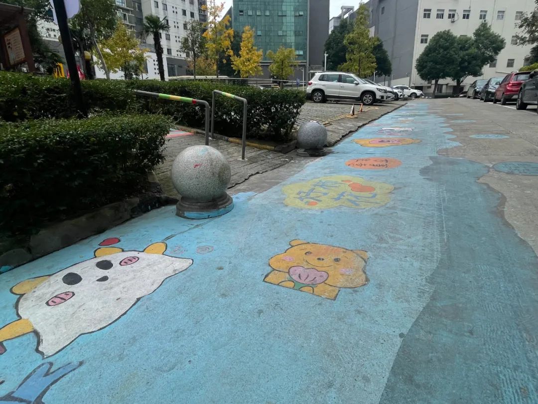 在这个康养长廊,有着健康知识、益智游戏、便民看报点等适老元素,悬挂着各种科学养老的知识小卡片,长廊一角打造了“今日有好报”读报点,由专人每日更换当日出版的各类报纸。社区邀请了公益组织希望美术教育和小朋友们用彩绘的方式,在康养走廊地面和周边道路水泥地面画上彩色卡通图案。走过长廊后有一截下坡道路,在醒目位置设置温馨提醒老人慢行的文明标牌,为小区老人全面营造安全便捷的通行环境。