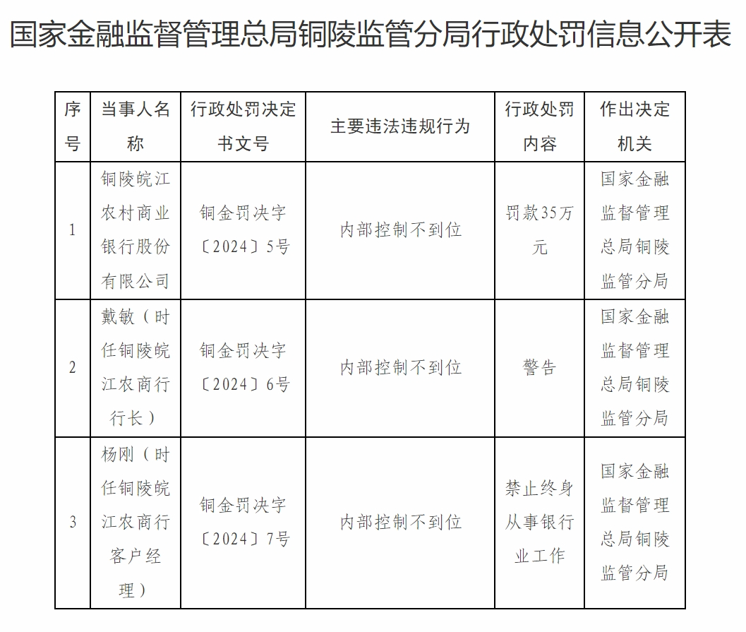 近日,安徽监管局披露行政处罚信息,因存在内部控制不到位。铜陵皖江农村商业银行股份有限公司被罚款35万元。戴敏(时任铜陵皖江农商行行长)被处以警告。杨刚(时任铜陵皖江农商行客户经理)被禁止终身从事银行业工作。