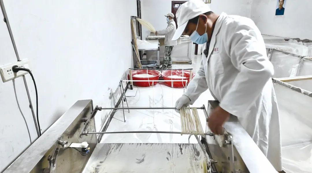 记者来到挂面文旅街规模最大的先友手工挂面有限公司,负责人刘先友正在准备要晾晒的面条,和面、打粉手续有条不紊。