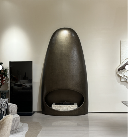 “我们曾为 CCD 红房子项目定制过液态金属壁炉,这次梧桐公馆的需求则偏向经典质感,因此选用了不锈钢镀铜板与不锈钢做旧板的组合工艺。” 鼎钻钢业技术总监介绍,液态金属与熔粹金属作为公司的创新核心产品,此次虽未直接应用于该项目,但相关工艺技术已融入弧形壁炉的加工中 —— 通过特殊冶炼工艺改变金属内部分子结构,使不锈钢板兼具硬度与韧性,确保 2000*4000mm 超大规格下焊接弧形蚀刻镀色仍能实现一体成型,无需拼接,从源头保证了壁炉的整体性与美观度。